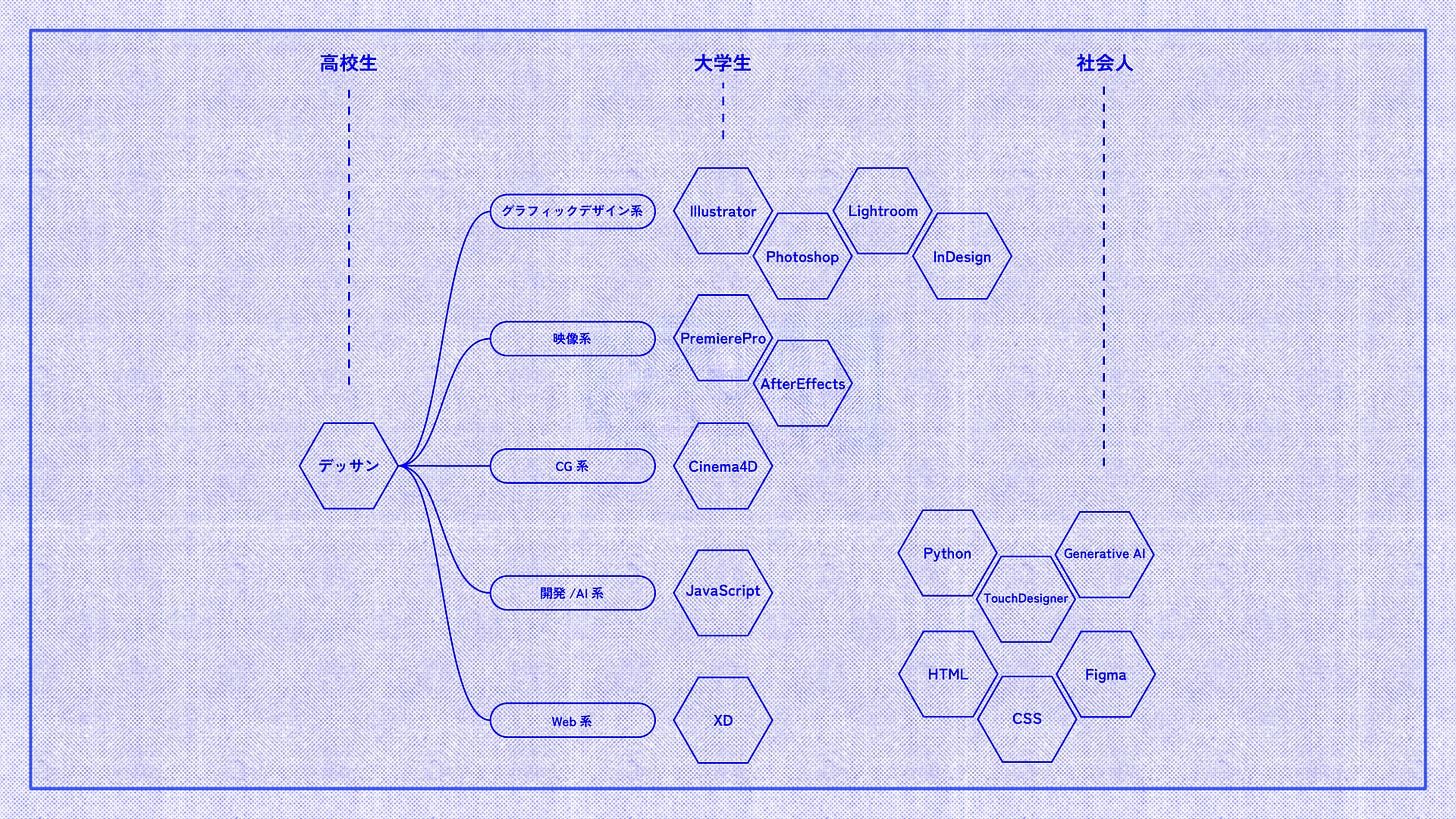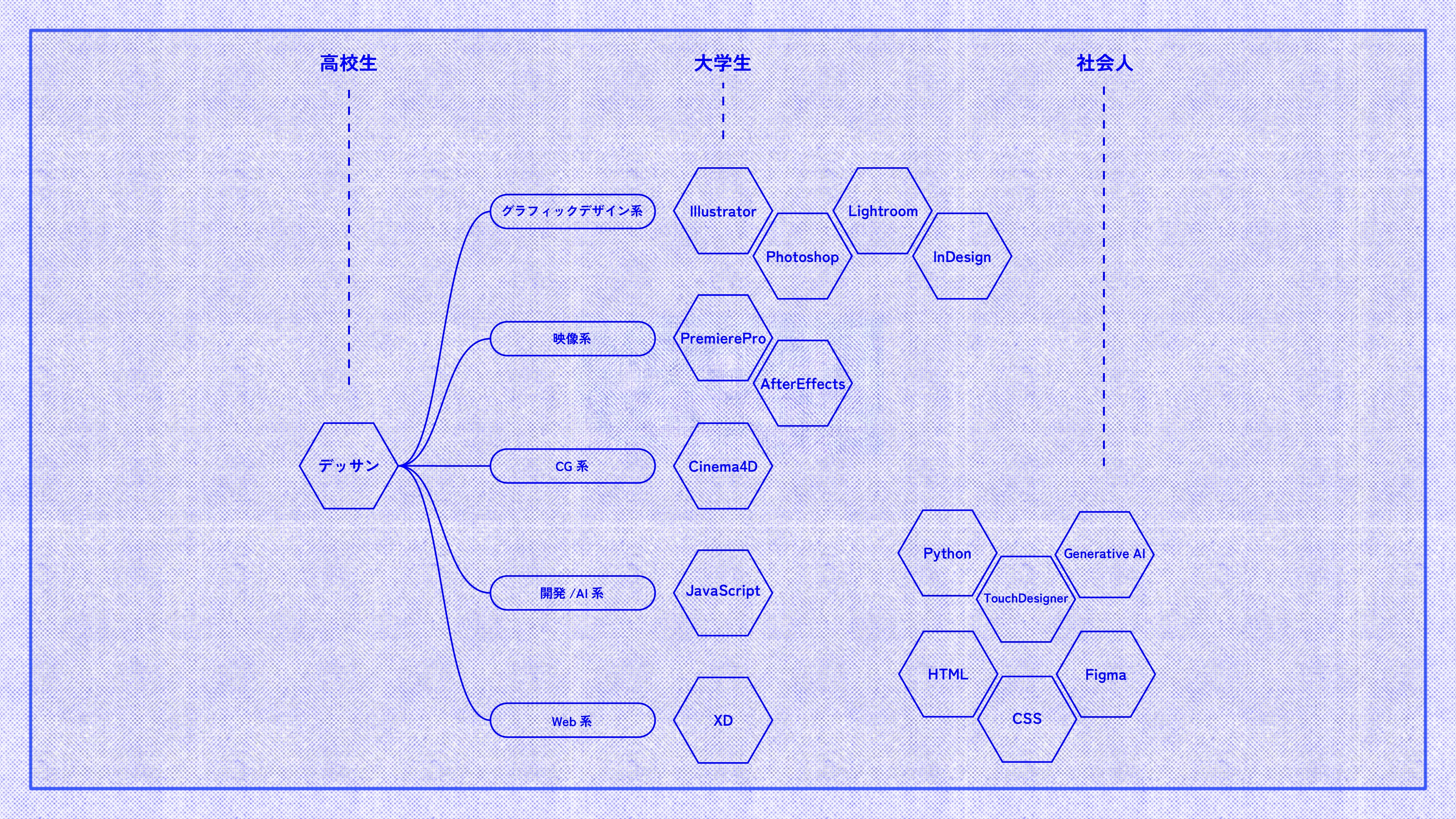 大学在学中から、グラフィックデザインや映像、CG、コーディングまで様々なツールを使って制作を行なっていました。卒業後もFigmaやTouchDesignerを触り始め、今では生成AIも含めてさらに多くのツールを駆使しながらプロジェクトを進めています。アウトプットの形式に合わせた最適なビジュアルでディレクションできるスキルは、自分ならではの強みと言えるかもしれません。